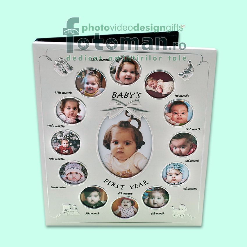Coperta exterioara se personalizeaza cu 13 fotografii (se vor incarca 12 poze cronologice cu primele 12 luni ale copilului iar poza din ovalul central va fi trimisa prin WhatsApp).