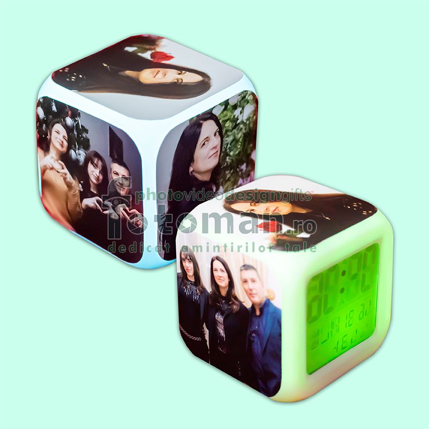 Ceas digital cu Led (3 culori afisaj), personalizabil cu 4 poze (dimensiuni autocolante foto 7.8cm x 7.8cm).