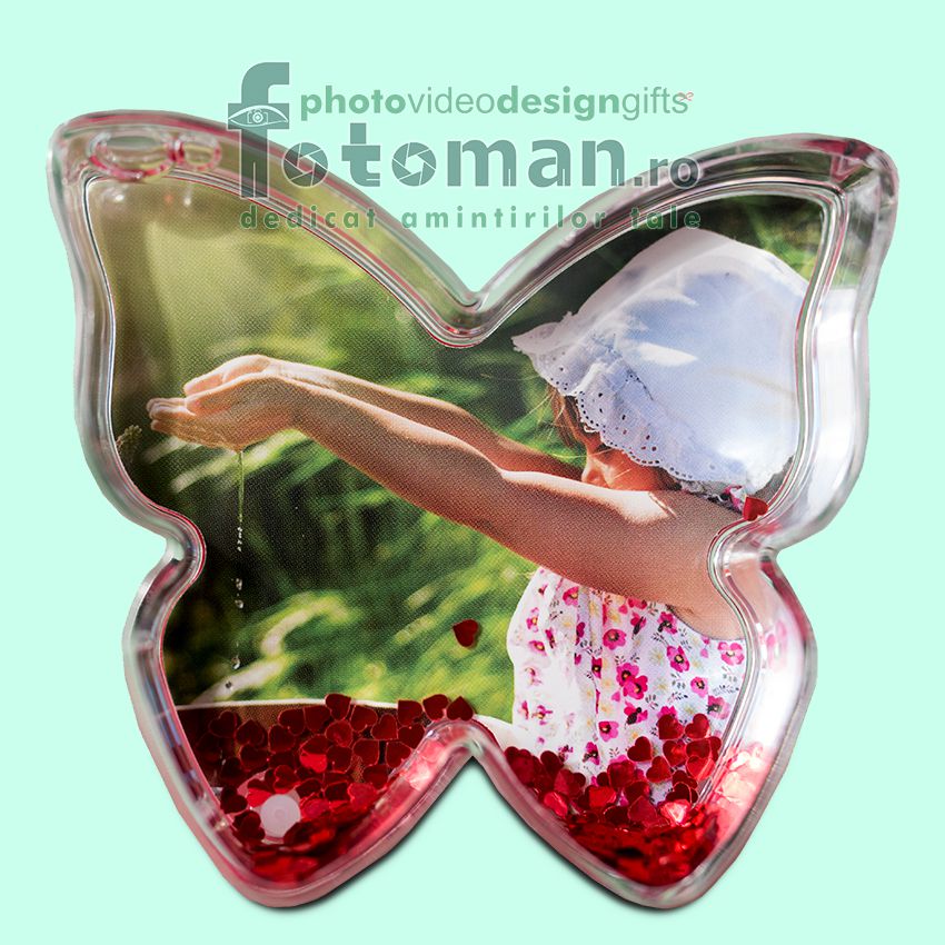 Globul de plastic este umplut cu apă și cu inimioare lucioase de culoare roșie.