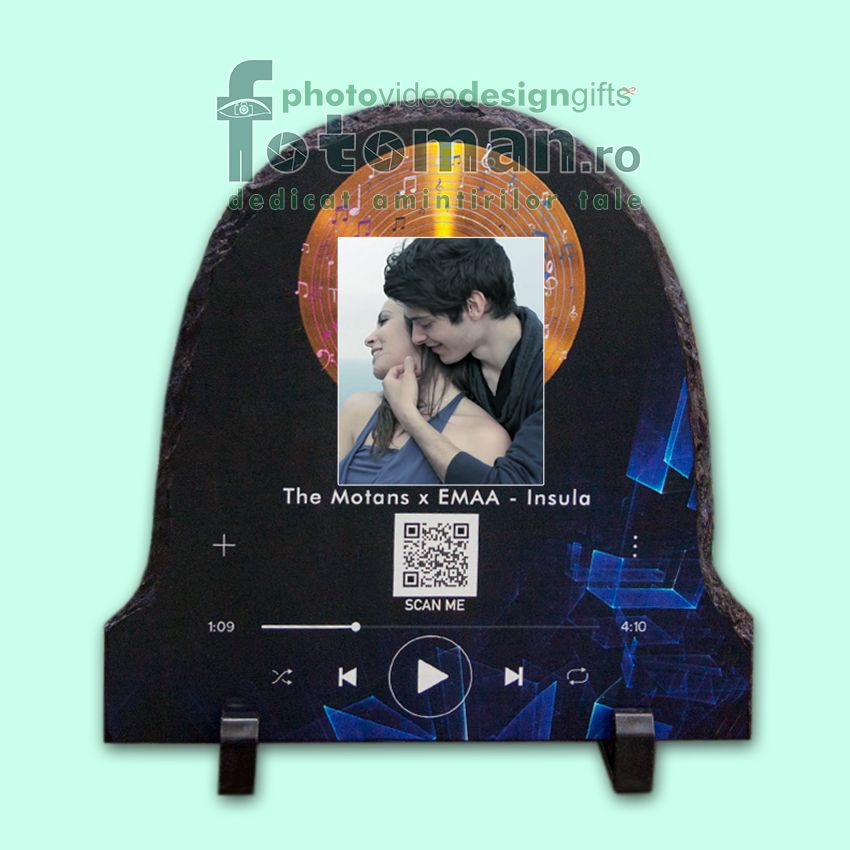 Produs personalizabil imprimat cu un cod QR care se poate scana cu telefonul/tableta cu trimitere directa la videoclipul preferat de pe aplicaţia Youtube.