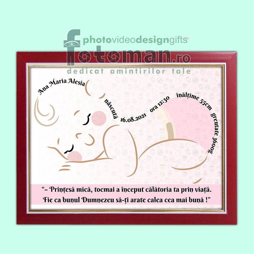 Se completeaza text personalizat cu: numele copilului, data nasterii, ora, inaltimea si greutatea