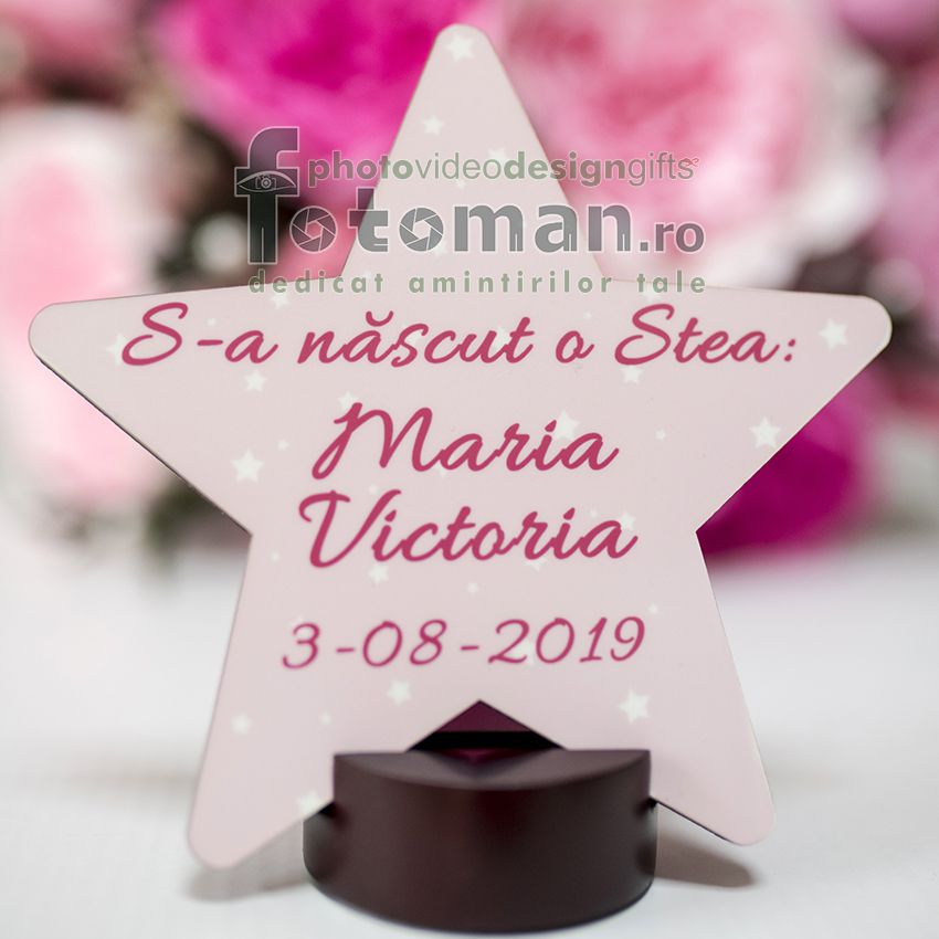 Steaua este prevazută cu suport de susţinere (lemn MDF), personalizarea se face pe o singură faţă.